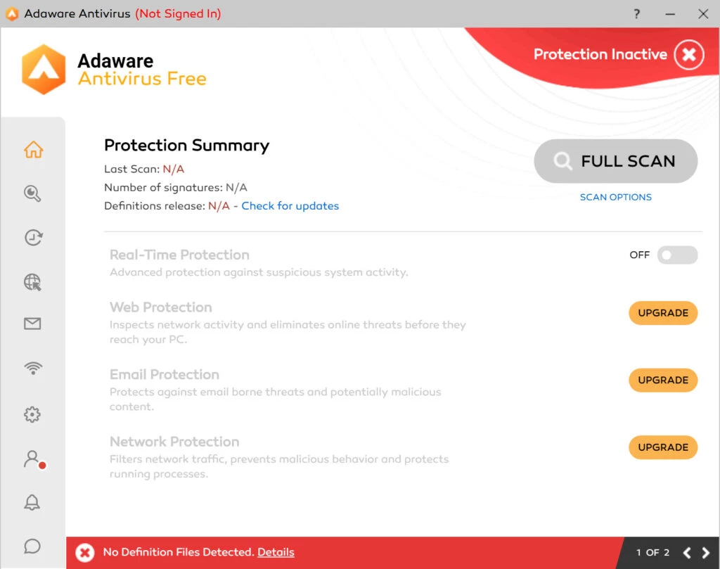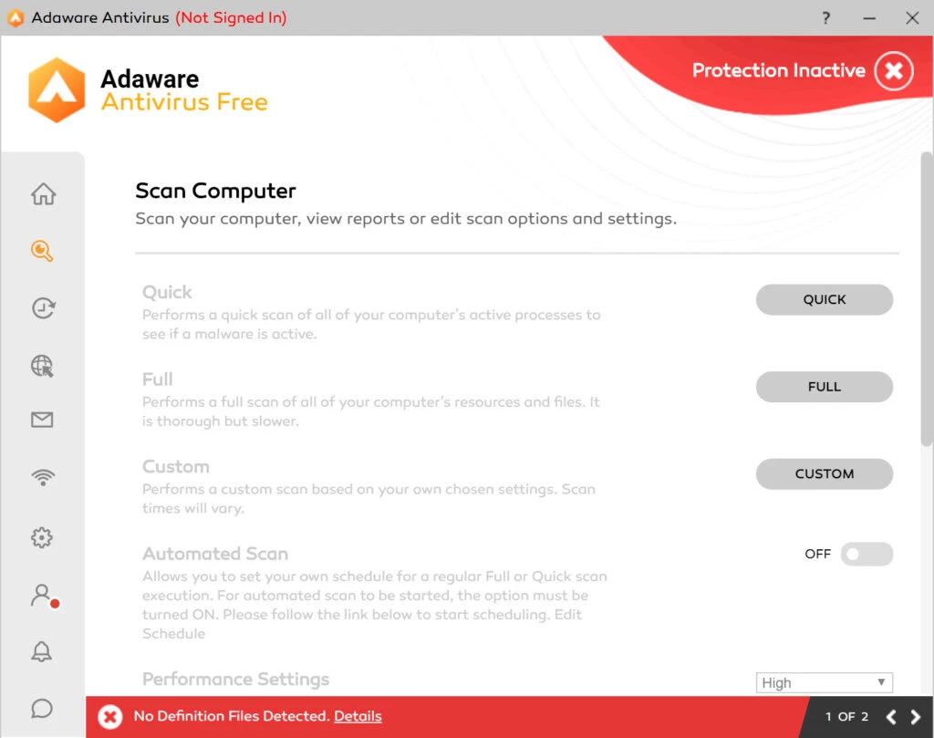 توفر Adaware أفضل تكامل مع أنظمة التشغيل Windows 10 و Windows 11 وتقدم 3 خيارات فحص رئيسية، بما في ذلك سريع وكامل ومخصص.